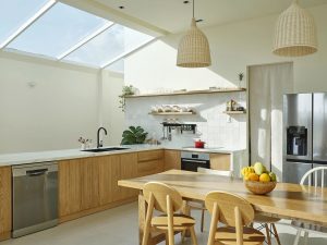 Trong quá trình thiết kế nhà, gia chủ có nhiều lựa chọn vật liệu sàn như: đá marble, đá nhân tạo, gạch lát, gỗ… Tuy nhiên, gỗ thường được ưu tiên sử dụng ở các công trình có người già và trẻ nhỏ, do có độ bám chân cao, an toàn khi trẻ chạy nhảy. Ngoài ra, nhờ hệ số dẫn nhiệt thấp nên việc lắp đặt sàn gỗ cũng giúp ngôi nhà mát vào mùa hè, ấm vào mùa đông.